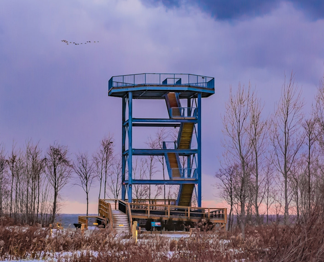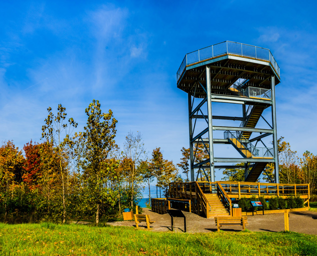 The 50-foot coastal observation tower at Lake Erie Bluffs is situated overlooking the lakeshore with multiple viewing platforms along a staircase that culminates in a deck featuring 360-degree-views. The height and location of the tower provide visitors with a unique view of the lake and the surrounding woods, fields and wetlands, along with a variety of wildlife–particularly a large number of bald eagles that are regularly seen at the park. The tower is accessible during regular park hours 6 am to 11 pm.