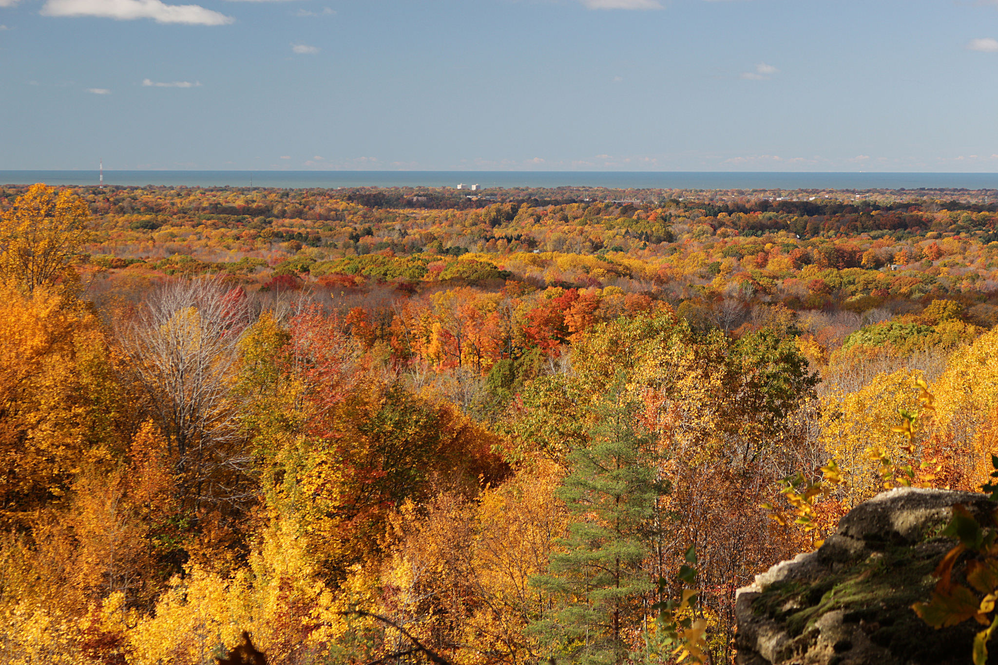 Wander through nearly six miles of trails surrounded by mature beech, maple, oak, tulip and hemlock trees. One of the best scenic overlooks in Lake County is found along Lucky Stone Loop Trail. Hiking in this beautiful forested park will take the park visitor to spectacular Sharon Conglomerate ledges, from which Lake Erie and the Cleveland skyline are visible on a clear day.