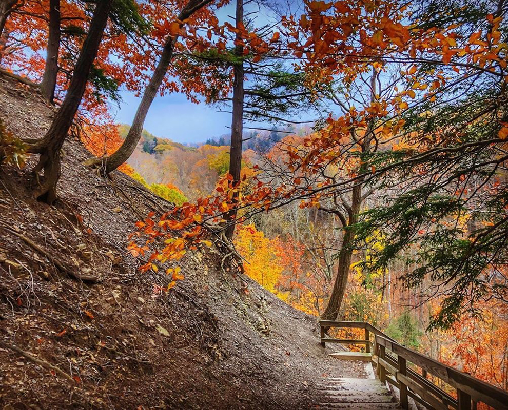 Hell Hollow Wilderness Area has a high cliff top with a loop trail and 262 timber steps that provide a dramatic descent to the creek valley. The more than 100-foot-deep ravine was carved thousands of years ago by Paine Creek after glaciers retreated from Ohio. This park offers impressive views of the 360-million-year-old Chagrin Shale cliff above a deep river valley. The name Hell Hollow—according to all known accounts—simply refers to the steep, rugged slopes that made it difficult to access and leave the “hollow.”