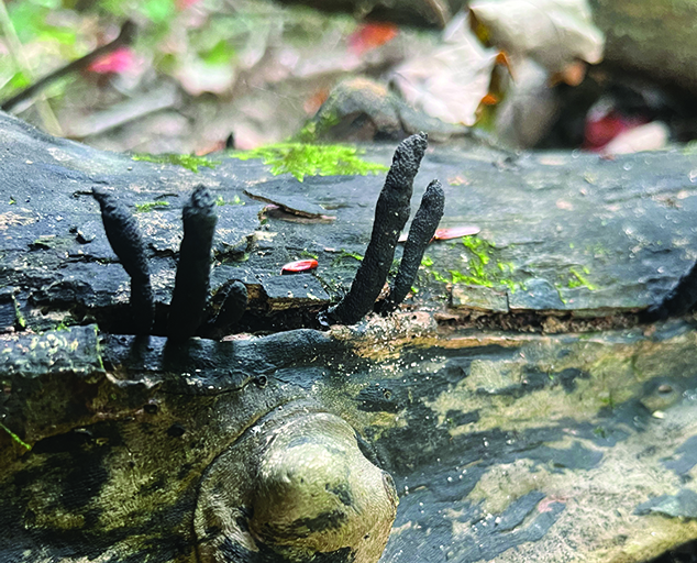 The first fungus has a very creepy name—dead man’s fingers or dead moll’s fingers. These are two different, but closely related species of fungi that feed upon decaying wood from hardwoods, especially maple and beech trees. These fungi get their names from the black finger-like fruiting bodies that pop up from the decaying wood.