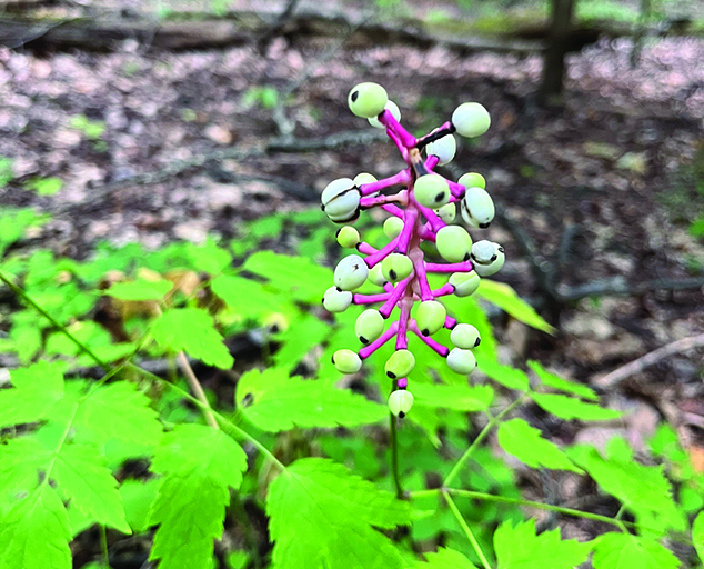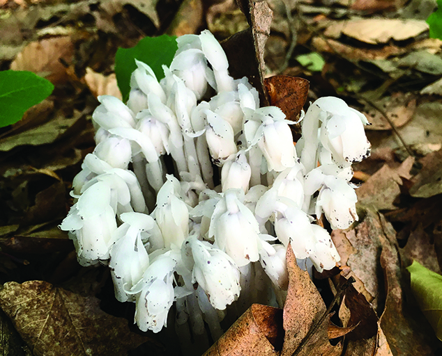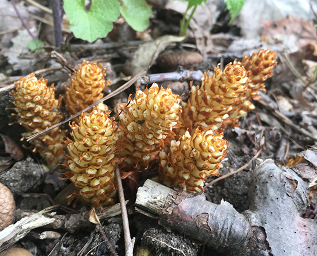 Next up is the spring blooming bear corn. Bear corn is named for the strange corn cob like appearance of its stems that contain its small tubular shaped flowers. This wildflower cannot produce its own food because it lacks the green pigment chlorophyll that is needed for photosynthesis. Bear corn derives its nutrients by acting as a parasite on the roots of woody species like oaks and beech. Fun fact: it takes bear corn four years of growth underground before it emerges above ground.