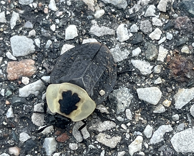 The next strange insect is the tomentose burying beetle. This beetle plays a strange but important role as the undertaker of the forest. Burying beetles locate small dead animals, dig holes under the carcasses and cover them with leaf litter. They then lay their eggs in