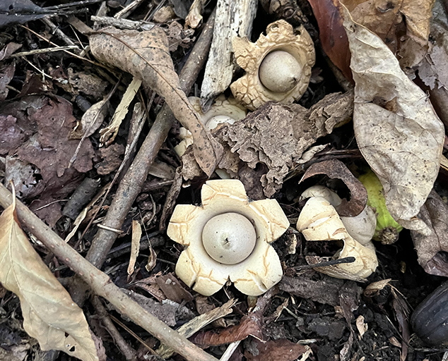 This next fungus looks strange, but is easy to miss on a walk through the forest if you are not looking down carefully: collared earth star. Collared earth star starts out looking like a puffball in its early stages. As the fungus matures, the outer layer of tissue splits open to reveal segments that spread outward in a star pattern with the spore sac sitting in the middle. This species is found in areas where there is a healthy amount of organic matter built up in the soil. These mushrooms can be found in the late summer and autumn after rain has soaked the ground.