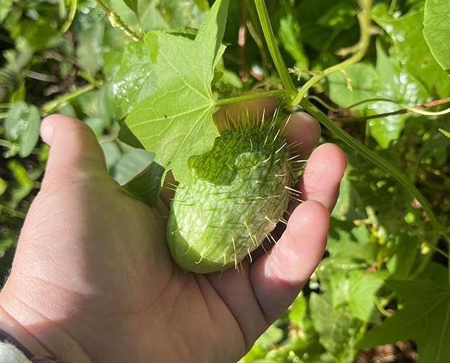Our final plant is wild cucumber vine. This vine is easy to overlook most of the year as it climbs over other vegetation. The strange part of this plant is its fruit that appears in late summer. If you look closely amid the vegetation, you will see a green, spiked ball, which is the wild cucumber. Despite the name, the fruit is not edible and is not spread by wildlife consumption. The fruit hangs on the vine over winter until it dries and bursts open to release seeds.