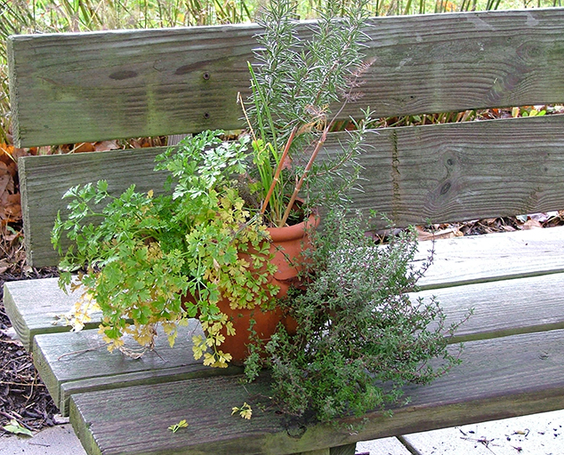 You can grow a nice potted herb garden out the kitchen door that can be attractive and useful. Oregano, thyme, sage and chives are all winter hardy perennial herbs that can overwinter in a pot. Parsley is biannual but will overwinter in a pot and can be harvested until late in the fall and again in the spring until it goes to flower. In late spring, you can add rosemary, marjoram or basil to the mix once the weather is frost free.