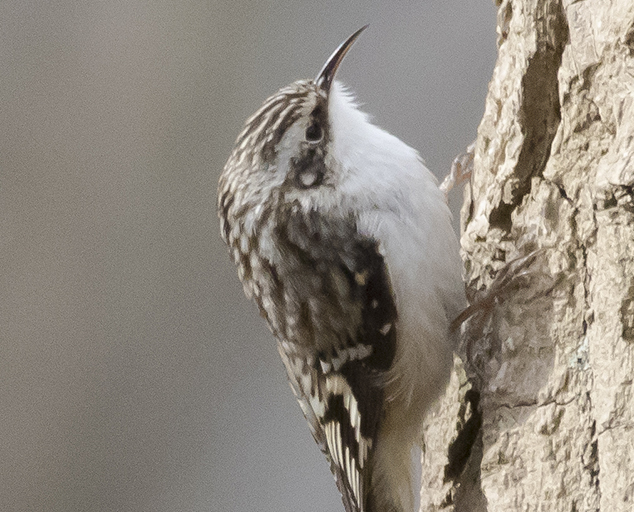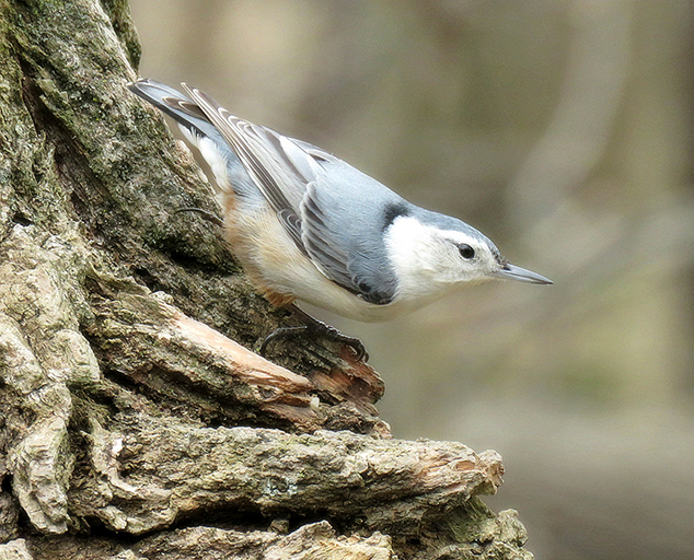 If you took a minute to look closely at what was in the flock, you would probably notice several different species of birds. Leading the pack are dapper black-capped chickadees. Black-capped chickadees usually stick together in groups of a dozen or more in the winter and lead these multi-species flocks on their quest for food throughout the forest. Among them (and equally as active) are small gray tufted titmice, who get their names from the pointy crests at the top of their heads. If you turn to the trunks of the nearby trees, you will likely see white-breasted and red-breasted nuthatches climbing down trees in search of insects and cached seeds among the bark. Near them, downy woodpeckers may be climbing up the trees and tapping at the beetle larvae just beneath the bark. In this group of climbing birds, you might see the well-camouflaged brown creeper as it zigzags its way up the tree trunk probing with its curved bill between the cracks in the bark for tasty insects.