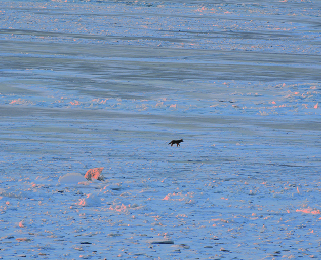 Our frozen Lake Erie resembles the arctic tundra as a sole coyote traverses a thick layer of first-year ice on a cold winter evening.