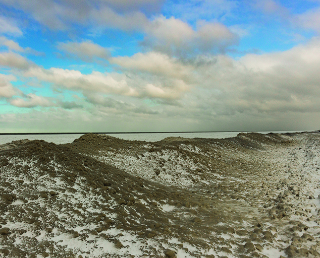 Fully formed ice dunes protect the shoreline from wave erosion during winter months. Ice beneath these dunes has been covered by accumulations of snow and slush.