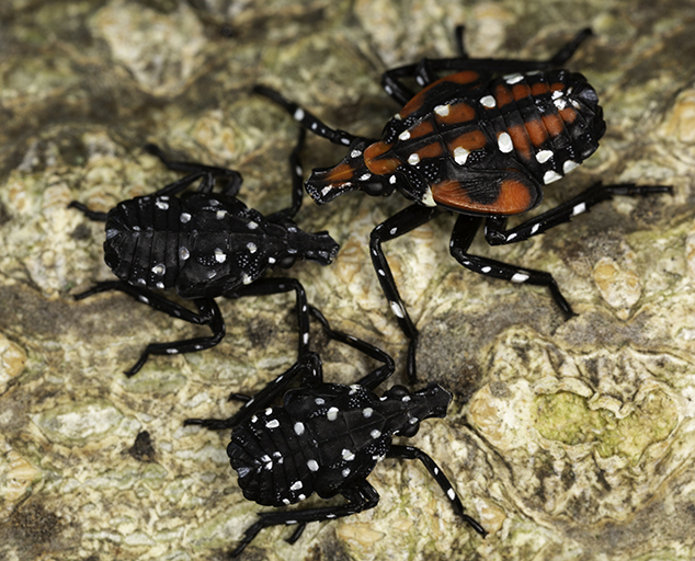 The spotted lanternfly is a type of planthopper insect that is native to Asia and feeds on the sap of trees. Though spotted lanternflies can be found on many species of trees, their preferred host tree is tree-of-heaven (Ailanthus altissima), which is an invasive tree here in the United States from their home range in Asia. The spotted lanternfly life cycle begins when eggs are laid by adults in the fall and hatch in the late spring. The eggs are covered in a waxy gray covering that look like dried mud and are laid in places like tree trunks, rock walls, rusty metal, grills, vehicles, trailers, firewood, outdoor furniture, bikes and toys. After hatching, the first four nymph stages are black with white spots. The fourth nymph stage is red with white dots and black stripes and usually occurs during mid summer. They mature into adults during late summer and autumn and are around an inch long with black bodies and brightly colored wings with black spots.