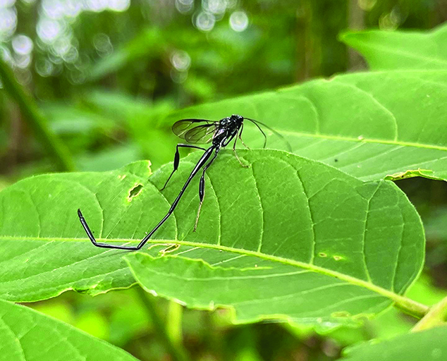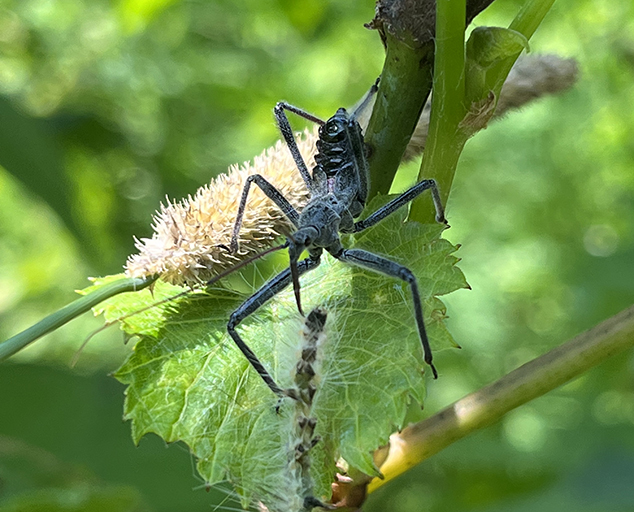 The first stop on the weird bug tour is the wheel bug. Wheel bugs are named from the cog-like wheel formation on their backs. Wheel bugs are voracious predators of caterpillars and beetles. They feed upon their prey by piercing them with their beaklike mouthparts that contain a chemical to help dissolve soft tissue into fluids that they then drink. This may seem creepy, but these insects are actually quite beneficial because they feed upon pests like Japanese beetles and tent caterpillars. Be warned: do not pick up this insect because it can deliver a painful bite. If you leave them alone, they will leave you alone.