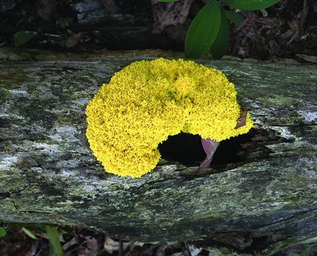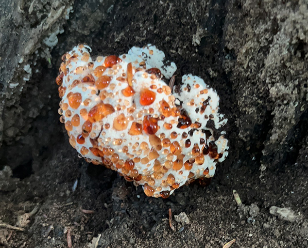 Our final strange resident is the dog vomit slime mold. You can’t miss this slime mold with its strange foamy appearance. It is often found on mulch after a heavy rain, but it can also be found on rotten wood, plant debris, and sometimes living leaves and stems of plants. Dog vomit slime mold is not a fungus. It is more closely related to amoebas than to fungi, plants or animals. These strange organisms can move about and will never be in the exact place as the previous day.