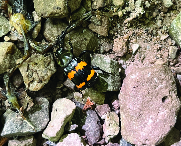 the soil near the carcasses, which will provide food for their young. Both males and females feed their larvae with predigested food and protect them from competitors until they are fully developed and ready to “leave the nest.”