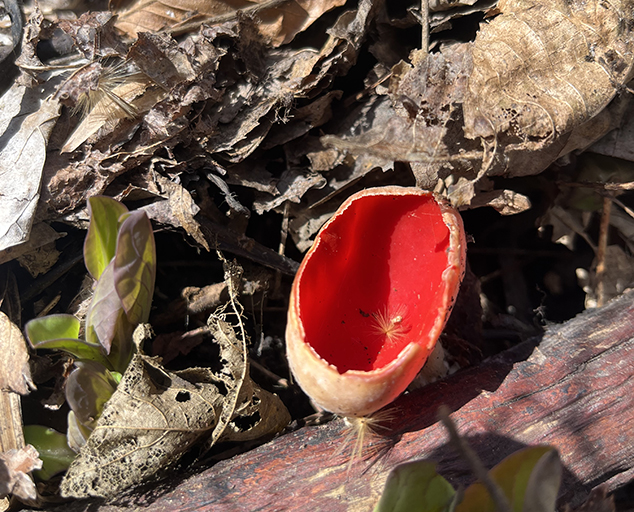 If you take a close look at the leaf litter in late winter and early spring, you may have a colorful surprise waiting for you: scarlet elf cup. This small fungus resembles a small tea cup on the outside. The inside is bright blood red, which stands out against the grays and browns of the forest floor. This fungus grows on decaying branches in damp areas. It is often one of the first mushrooms to emerge in the new year.