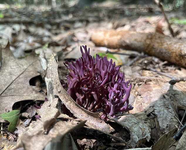Our next fungus looks more at home on the seabed than in the forests of Lake Metroparks: violet coral fungus. This stunning fungus is neon purple and can be found growing near hardwood trees and usually with mosses. They seem to sprout from nowhere on the forest floor during the summer and fall and can be seen in large populations during wet summers.