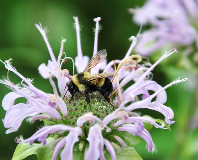 Rusty Patch Bumblebee: A once-common bee recognized by the rusty band on its abdomen, it is now rare and relies on healthy habitats to survive. The Rusty Patch bumblebee is the first bumblebee to be listed as an endangered species, making it federally protected since 2017. The species saw a large drop in population due to loss of habitat, disease and pesticides.