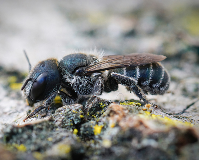 Blue Mason Bee: A small, gentle pollinator known for its bright blue sheen and hardworking nature. Unlike hive‑forming bees, they live alone, building their nests in small holes found in wood, stems or old insect tunnels. Their name comes from the way they seal their nests with mud, much like a mason working with mortar. These bees are incredibly helpful to gardens and wild spaces because they pollinate early‑blooming plants when few other bees are active. A single blue mason bee can do the work of many honeybees, making them powerful partners in keeping plants healthy. They rarely sting and only do so if handled roughly, which makes them safe around people.