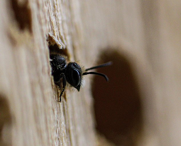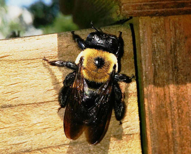 Carpenter Bee: Often misunderstood bees that appear to eat wood and attack people. These bees may sound aggressive but are actually very docile. Carpenter bees do not eat wood for nutrition, they require carbohydrates, protein, minerals and vitamins for a complete diet. They are expert engineers and even reuse sawdust for laying eggs. They are so precise in their burrowing that they can make 90 degree turns in their tunnels.
